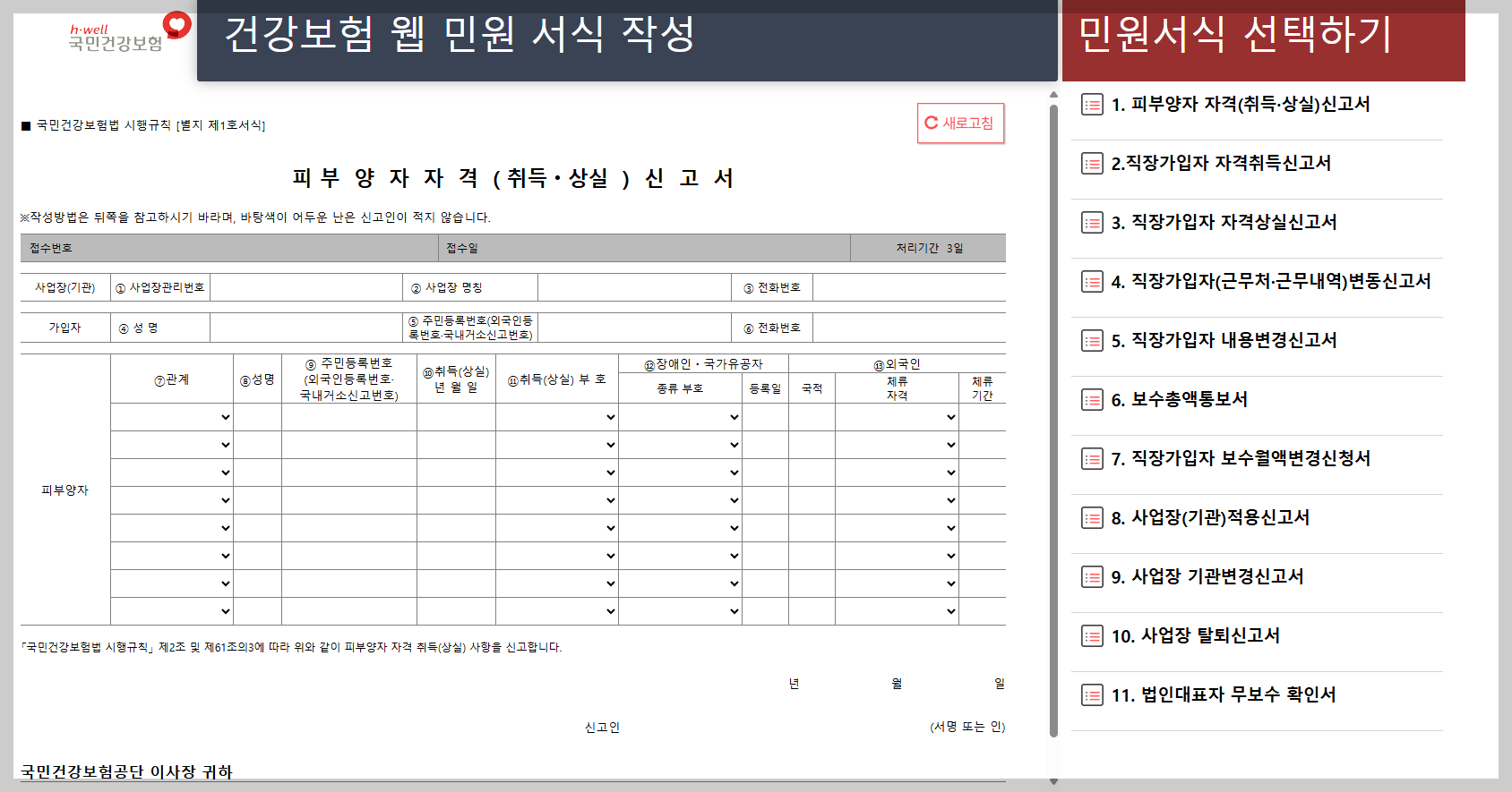 자세한 내용은 국민건강보험 홈페이지나 The건강보험 모바일 앱 들을 통해 신고 할 수 있다.