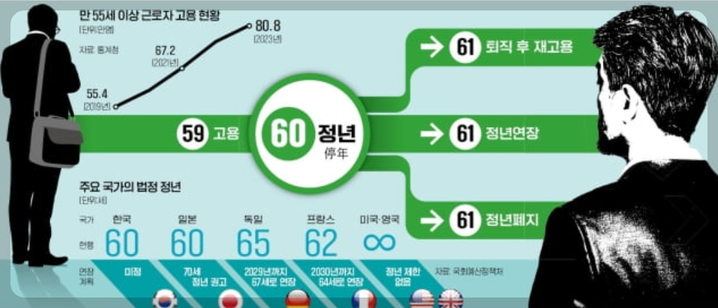 정년은 60세까지지만 '정년을 연장하거나', '계약직이나 촉탁직으로 재고용하거나', '정년을 아예 폐지하거나' 하는 방법을 택하도록 했습니다.