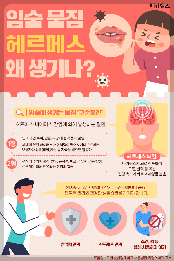 구순포진은 흔히 '입술 헤르페스'라고 불리며, 단순 포진 바이러스(HSV)에 의해 발생하는 감염입니다.