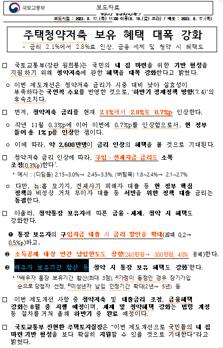 현재 금리 2.1%에서 2.7%로 상향이 된다고 한다. 예전에 전세대출을 처음 받을 때 3.8%로 받았었는데........뭐 연관된 내용은 아니다. 지금의 청약통장의 금리가 시중은행보다 낮아져서 저축을 목적으로 하는 용도는 아니였는데 나름 좋은 소식으로 보여진다. 자료를 찾아보니 이번 금리인상으로 우리 국민의 2천 600만 명이 혜택을 보게 된다고 한다. 하지만 청약통장에만 적용되는 것은 아니다.