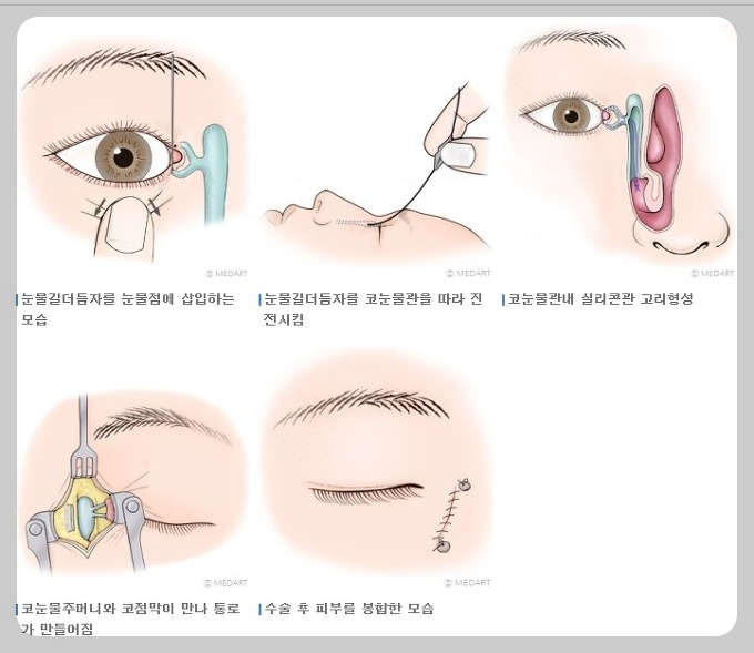 만약 눈물관이 막혀 있다면, 눈물관을 넓히는 수술이나 실리콘관 삽입술이 필요할 수 있습니다.