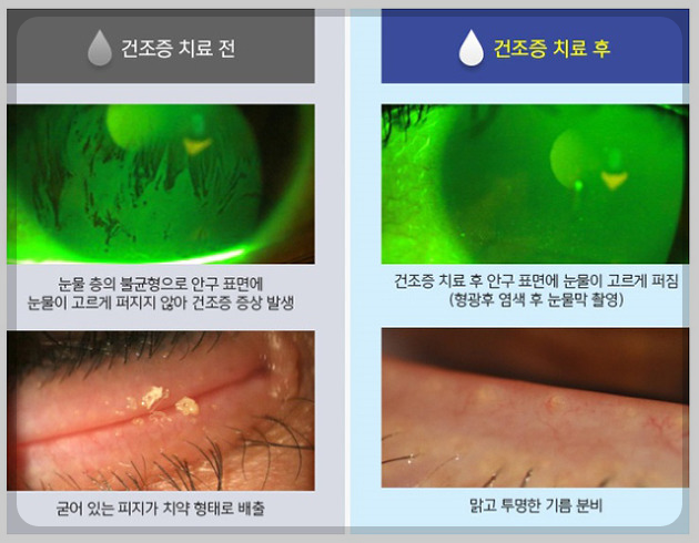 치료 전후의 눈 상태를 비교해보면, 치료 후 눈이 더 촉촉하고 건강해진 모습을 확인할 수 있습니다.