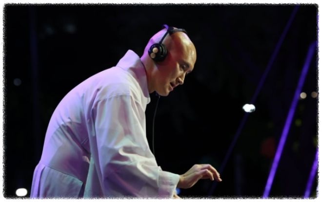 뉴 진스님은 승려 복장을 입고 EDM 공연을 하며 젊은 층과 소통하고 있습니다.