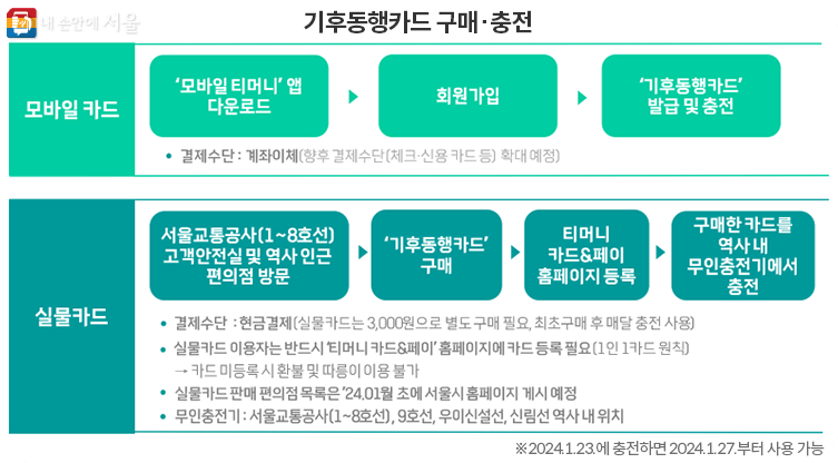 실물카드는 서울교통공사 1~8호선 역사 내 고객안전실에서 현금 3,000원에 판매한다. 현재 1차 판매분 10만장 제작을 완료하고 배부 준비 중이며, 이후 실물카드 판매상황을 모니터링하면서 필요한 물량을 추가 제작 및 판매하여 현장에서 시민불편이 없도록 할 계획이다. 또한 서울교통공사 1호선~8호선을 이용하지 않는 분들을 위해 서울시내 편의점 구매가 가능하도록 판매처를 모집하고 있으며 판매처 목록이 확정 되는 대로 120다산콜센터와 서울시 홈페이지 등을 통해 안내할 예정이다. 실물카드를 구매하면 역사 내 교통카드 무인충전기에서 현금충전으로 하고 5일 이내에 사용일을 지정한 후 이용하면 된다.