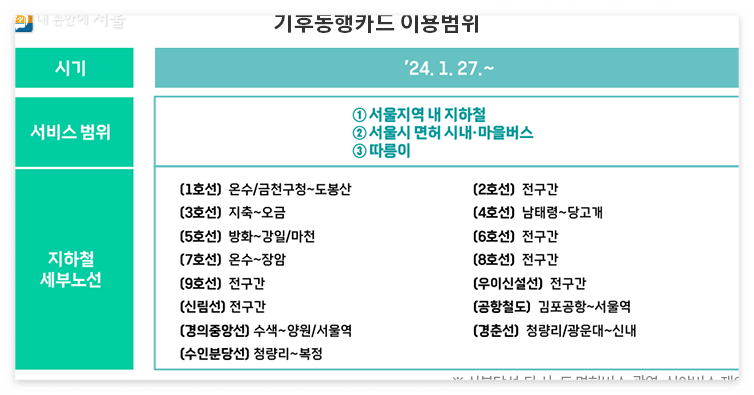 이에 따라 사업 시작과 함께 서울 지역 내 지하철 1~9호선, 신림선, 우이신설선, 수인분당선, 경춘선, 경의중앙선, 공항철도 서울~김포공항까지 모든 지하철에서 무제한 이용이 가능하며, 다만, 신분당선은 요금체계가 상이하기 때문에 서울구간 내라도 이용이 제한된다.