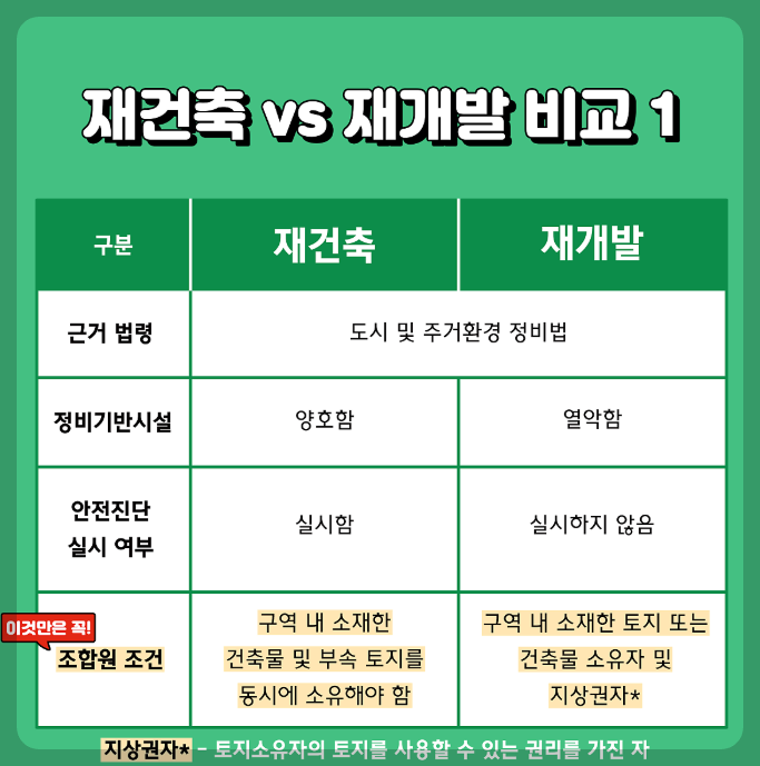 둘째, 재건축은 건물과 토지를 동시에 소유해야 하며, 재개발은 토지만 소유해도 참여할 수 있습니다.