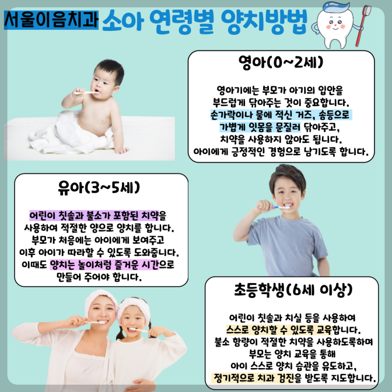 아이의 나이에 따라 양치 방법과 습관이 달라져야 합니다.