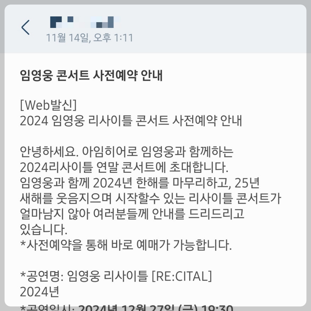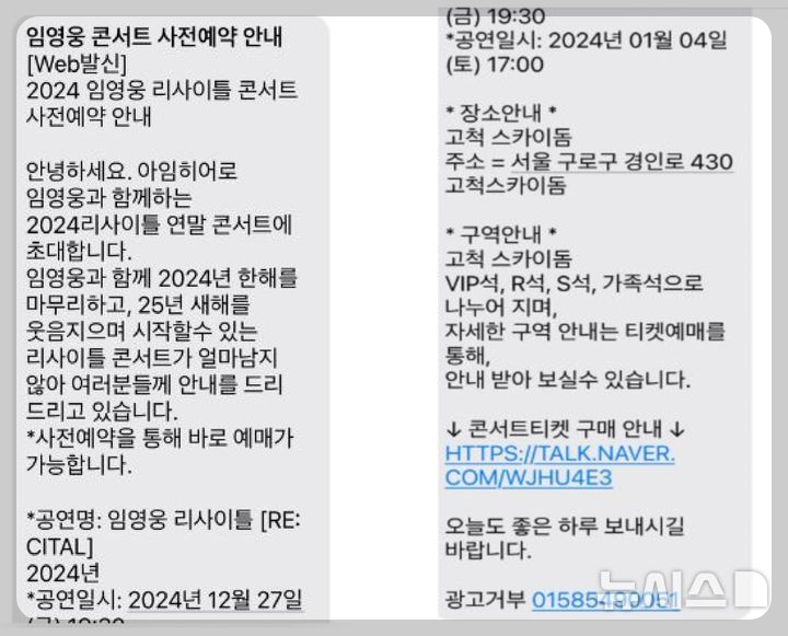 예를 들어, "임영웅 연말 콘서트, 사전예약 가능해요"라는 제목의 문자가 발송되며,
